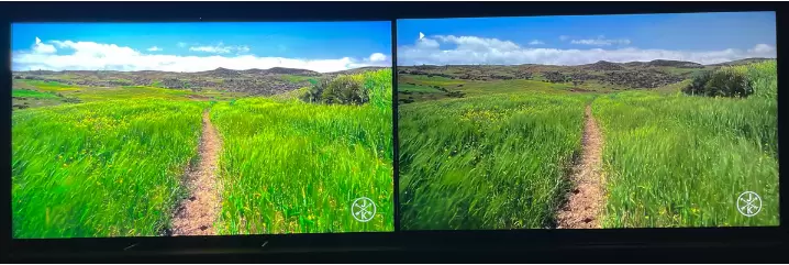 左索尼X95EK 右TCL X11,在索尼X95EK上不仅草皮植被色彩更真实,远处天空的白云也有着更接近真实的天空的观感,X11的天空则有点霾的感觉
