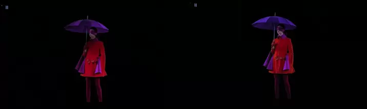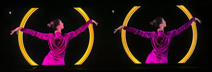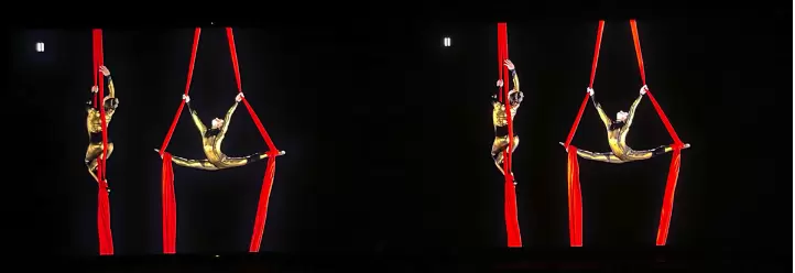 左索尼X95EK 右TCL X11,在单色的裙子和袜子表现力上是十分考验电视的色彩能力,慢动作的画面下两台电视都没有出现常见入门级电视可能出现的涂抹感,细节还原能力都很好,而X95EK更好的表现了光线从左上方照下来的自然过渡
