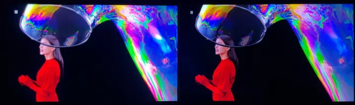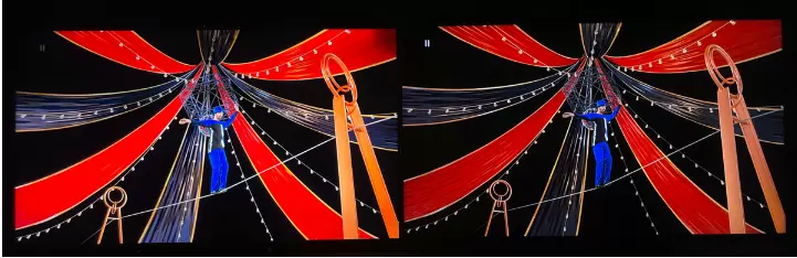 左索尼X95EK 右TCL X11,在X95EK上的红色缎带有着更通透立体的表现力,体现了对比度优势