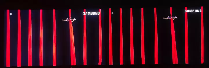 左索尼X95EK 右TCL X11,这个缎带下落的画面中,相邻缎带之间在X95EK上也出现了淡淡的光晕