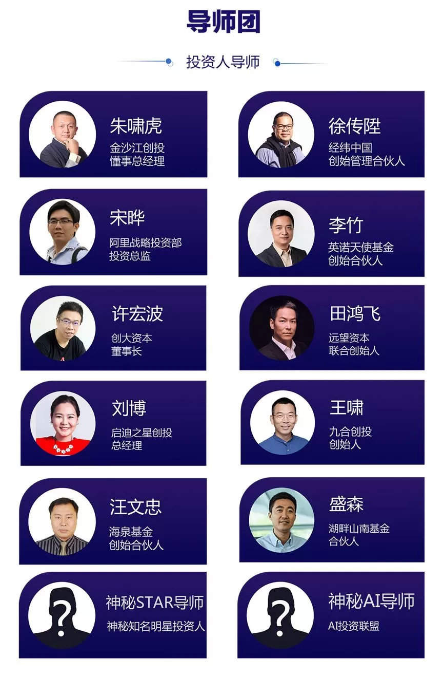 此外,英诺天使基金创始合伙人李竹、创大资本董事长许洪波、远望资本创始合伙人田鸿飞、启迪之星创投总经理刘博、九合创投创始人王啸、海泉基金创始合伙人汪文忠、湖畔山南基金合伙人盛森等,共同组成了强大的投资人导师团,届时更有神秘AI导师和明星导师将会出席: