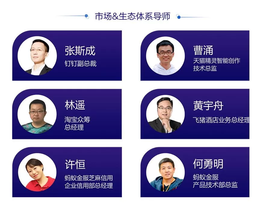 此外,淘宝众筹的绿色通道将为学员提供一整套持续性服务,蚂蚁芝麻信用将直接精准筛选C端客户,蚂蚁金服开放平台则可以对接海量的用户。例如菜鸟、零售通、中供铁军等,各业务方的行业线资源也会根据学员需求进行对接匹配,对学员进行全方位生态对接,市场&生态体系导师团如下: