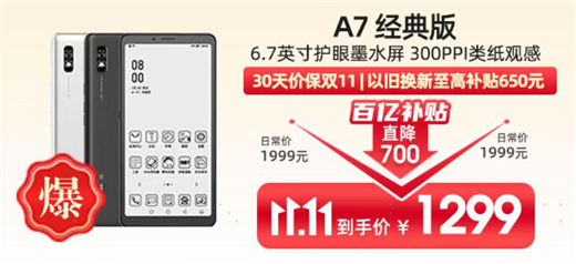 10月20日20:00至10月31日24:00,海信阅读手机A7在海信手机京东自营旗舰店开启双十一提前购活动,优惠直降700元,到手仅需1299元,此外还享受30天双十一价保等多重豪礼,机会难得,购机从速。