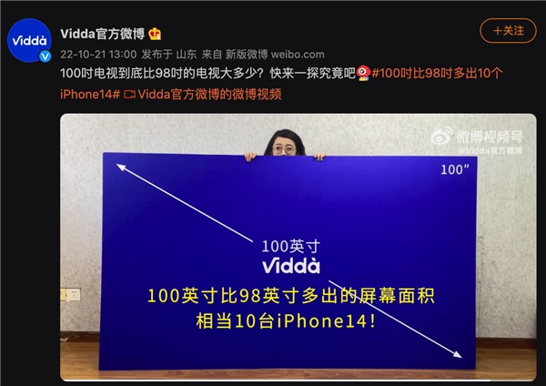 据了解,现在市面上已经有多个品牌推出了98英寸的巨屏电视,而且都会打着“百英寸级”的口号在宣传。而Vidda官微这个视频就通过一道简单的除法算式让大家明白:真正的100英寸电视比98英寸电视多出来的屏幕面积,相当于10个iPhone 14的屏!这样看上去,100英寸和98英寸差距还真是不小。