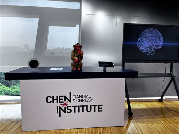 展品是一只猕猴的模型,猴子的头部是一个脑机接口半植入体,产品名为集成式颅顶半植入BCI产品-NeuroInterface。这是一款满足高通量、高采样率信号采集与处理功能的半植入医用级BCI产品。右侧的圆盘是电极晶圆模型,用于制成与植入体相匹配的植入电极。