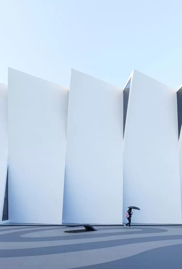 有些“巧合”“偶遇”的奇妙时刻往往总是一晃而过,要想捕捉到精彩瞬间,须得有快、准、稳的对焦速度和准度,这一点松下Lumix S 18mm F1.8也没有让我失望。例如下图人物举伞行走路过建筑,一身黑色搭配恰好与白色建筑主体形成鲜明对比,成为此画面点睛之笔。由于人物出现太突然,没设置追焦,要让人物出现在想要的位置,又要避免错过,只能不断按快门多拍摄一些,从中挑选出最称心如意的一张。幸好这枚镜头对焦速度快又精准,让我能够在短时间内获得多张图片得以选择。