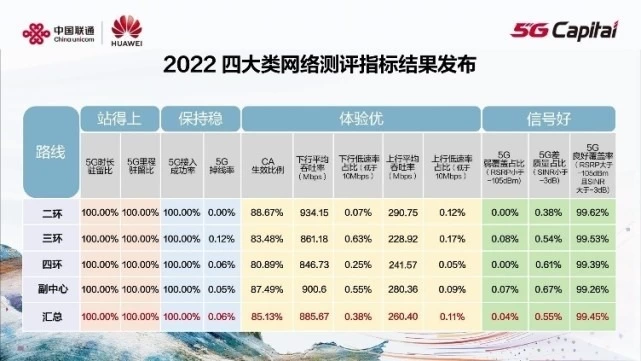 凭借北京联通创新的数字化运营模式以及华为5G创新技术,双方于2022年8月完成了超过3000个站点的200MHz大带宽网络部署,实现了北京城市核心区域的全面覆盖。并于9月底,双方邀请主流媒体代表最终用户对该200MHz网络的主要交通干线、街巷毛细道路进行了四大类“占得上、保持稳、体验优、信号好” 十二项指标的全面测评。其中,此次体验测评引入了CA生效比这一新指标,用于体现200MHz大带宽的CA的连续性表现。测试结果表明,CA生效比达到了85%,5G用户下行峰值速率达到1.8Gbps,下行平均吞吐率达到885.7Mbps,上行峰值速率达到400Mbps,上行平均吞吐率达到260.4Mbps,信号良好覆盖率保持在99%以上。优异的指标表现,完全支撑了在高速车载移动场景下移动办公、移动教育、移动娱乐、以及AR/VR等4项5G典型应用。