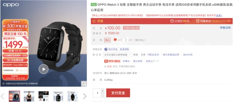 10月20日起,OPPO Watch 3系列和OPPO Watch SE在京东、天猫平台开启优惠福利:预付定金后,OPPO Watch 3系列尾款优惠100元,OPPO Watch SE尾款优惠50元!OPPO Watch 3 Pro 铂黑到手价1899元,OPPO Watch 3 Pro 漠棕到手价1999元,OPPO Watch 3 铂黑到手价1499元,OPPO Watch 3 羽金到手价1599元,享受12期分期免息;OPPO Watch SE到手价949元,享受6期分期免息。值得一提的是,预售期间购买OPPO Watch 3系列赠送牛皮表带及两张Keep会员双周卡,10月31日晚8点京东平台付尾款,还有机会获得免定金权益!
