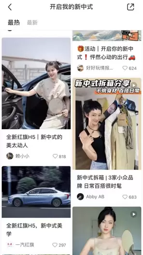 小红书与全新红旗H5推出#开启我的新中式 主题活动,邀请每一个爱好新中式的年轻人,一起诠释身边的新中式美学。在话题词下,可以看到成千上万的用户积极分享身边的新中式美学元素,一同让新中式美学成为时下最热的流行关键词之一。