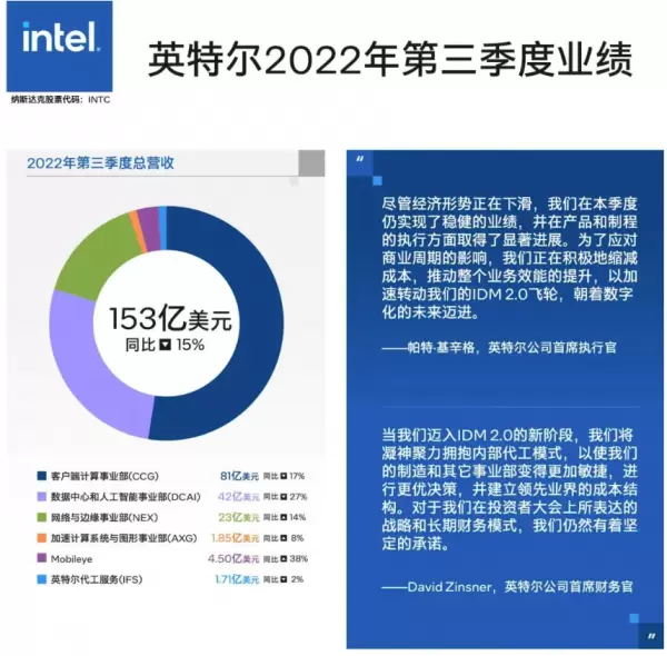 当前的时间点是众多科技企业公布Q3财报的时刻,英特尔也公布了2022年第三季度的业绩:Q3营收153亿美元,同比下降15%。其中,客户端计算事业部营收81亿美元,同步下降17%;数据中心和人工智能事业部营收42亿美元,同比下降27%;网络与边缘事业部营收23亿美元,同步增长14%;加速计算系统与图形事业部营收1.85亿美元,同比增长8%;Mobileye营收4.5亿美元,同步增长38%;英特尔代工服务营收1.71亿美元,同比下降2%。