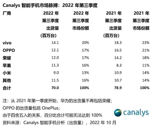 2022年10月27日,据Canalys统计数据显示,2022年三季度中国智能手机市场较第二季度略有改善,出货量为7000万部。其中,OPPO出货量为1210万部,稳居市场前二。
