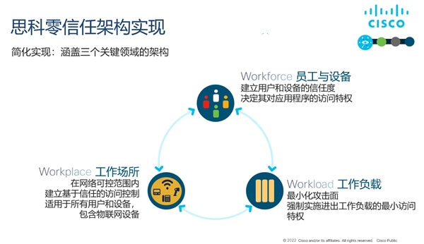 思科的零信任概念包括三个W,分别适合IT环境下三个主要角色,一是Workload,主要是在数据中心领域;二是Workforce,是指使用IT资源的参与者;三是Workplace,是指提供办公的基础环境。