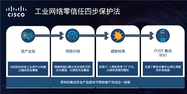 零信任安全策略是一个长期的过程,思科以“工业网络零信任四步保护法”保护企业资产。首先,资产发现,识别企业所有工业资产以构建正确的安全策略;其次,网络分段,隔离网络以建立安全域和可控访问通道,以避免攻击蔓延;再次,威胁检测,检测IT入侵和异常OT行为,以保持流程完整性。最后,IT/OT集成SOC,全面了解安全事件以简化调查和补救措施。