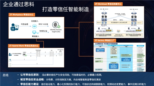 思科的零信任方案为制造企业在各种应用和整个环境中,来自任意用户、设备和位置的访问提供完善的保护,员工、工作负载和工作场所都处于思科零信任安全框架的安全防护中。零信任办公场景下,思科身份服务引擎(ISE)可实时调配有关网络接入设备的策略,使移动用户或远程用户能够以可信合规的方式通过无线连接获得与有线连接一致的服务访问体验。在混合办公场景下,无论员工在任何场所,都可以通过安全专用通道连接公司的各种业务程序,实现灵活安全办公。