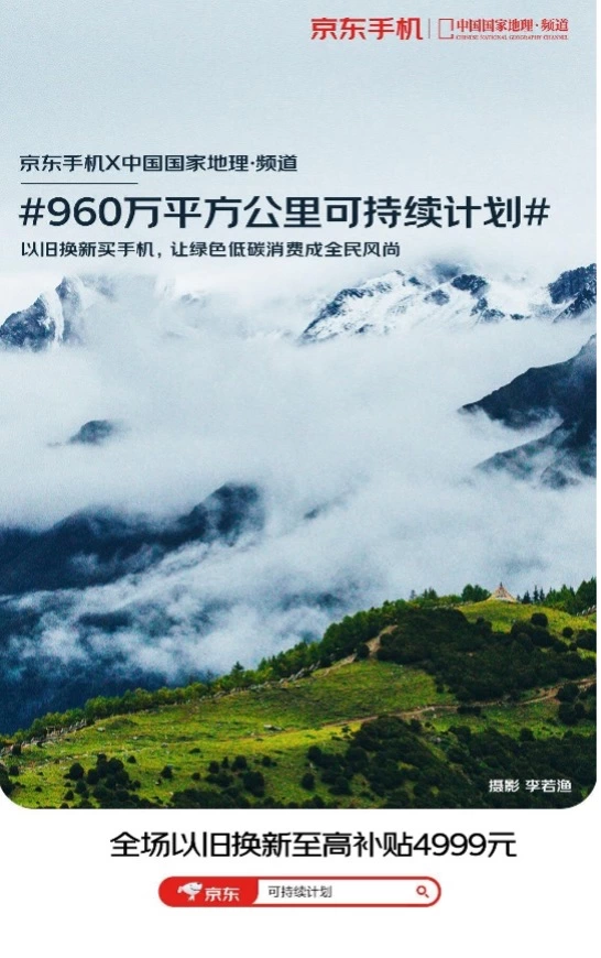 有共识,更要有行动。除了联合中国国家地理·频道、手机品牌在微博发起#用手机记录祖国大好河山#征集活动,以互动的方式,号召用户拥抱绿色低碳生活方式外,用户在购买手机时可实现跨品类以旧换新,家里闲置的电子产品均可用来换新手机,既能有效处置了旧产品保护了环境,又能降低了换新成本。同时,用户在京东每完成1笔手机产品以旧换新订单,京东都将捐款1元用于防治荒漠化树苗的种植与养护。