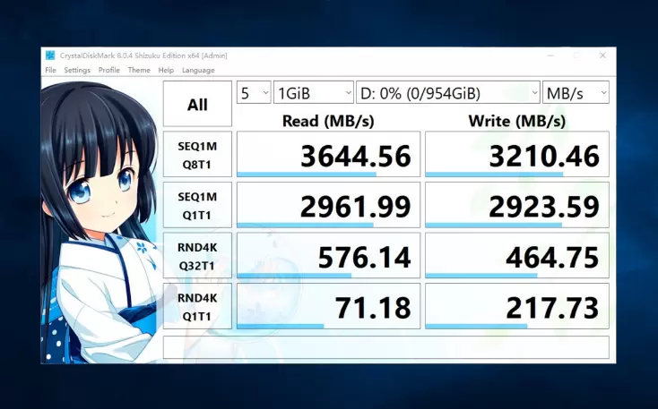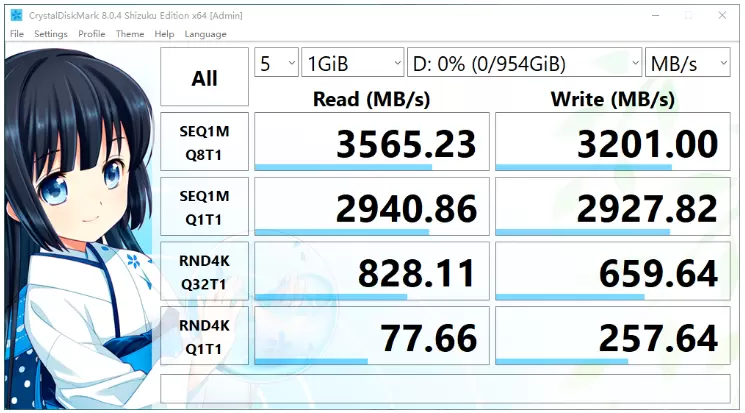 首先是空盘状态的CrytalDiskMark跑分,Intel平台下3565.23MB/s和3201MB/s的连续读写已经超出官方标称成绩,达到PCIe3.0天花板级别实力,4K小文件表现同样可圈可点,完全能和部分PCIe4.0的SSD有一战之力,满足日常使用的流畅体验轻轻松松。