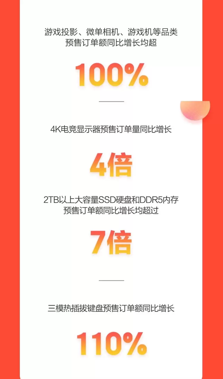 同时,游戏投影、游戏机等品类预售订单额同比增长也均超过100%。此外,游戏爱好者对网速、显示效果、性能配置也提出了更加严苛的要求,4K电竞显示器预售订单量取得了同比增长4倍的好成绩,2TB以上大容量SSD硬盘和DDR5内存的预售订单额也同比增长均超过7倍,三模热插拔键盘预售订单额同比增长110%。