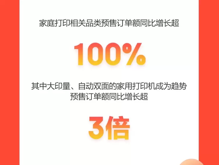 此外,随着居家学习和办公成为了当下常态,打印机正在变得更加智能化、更加切合用户的个性化需求,家用打印机正成为学生一族、办公白领的必备好物。从京东11.11电脑数码的预售战报数据可以看到,家庭打印相关品类预售订单额同比增长超100%,其中大印量、自动双面的家用打印机成为趋势,预售订单额同比增长超3倍。
