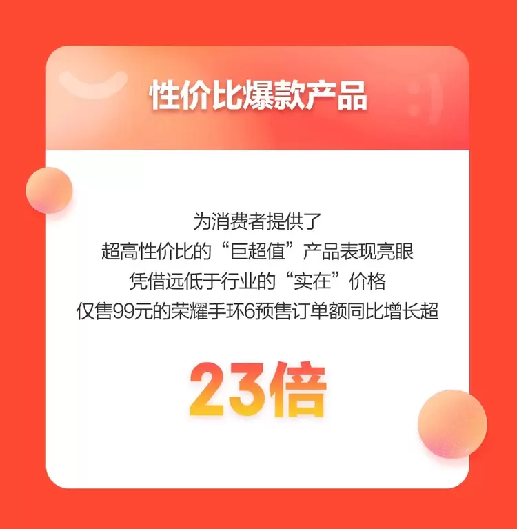 数据显示,为消费者提供了超高性价比的“巨超值”产品表现亮眼。凭借远低于行业的实在价格,京东11.11预售期间,仅售99元的荣耀手环6预售订单额同比增长超23倍,成为当之无愧的爆品。