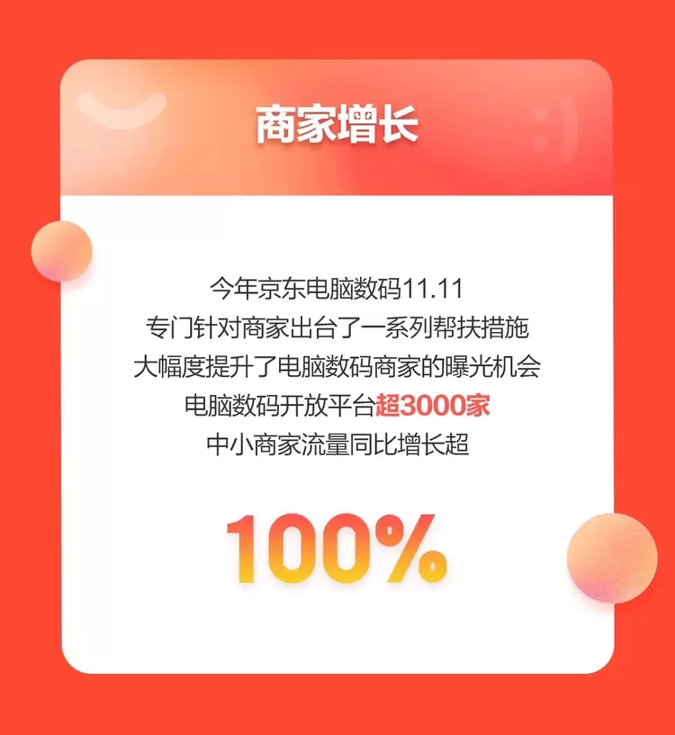 今年京东电脑数码11.11专门针对商家出台了一系列帮扶措施,包括商家专属营销节点、流量扶持政策、新商家专属流量场等,大幅度提升了电脑数码商家的曝光机会。战报数据显示,仅预售期间,电脑数码开放平台超3000家中小商家流量同比增长超100%,京东助其实现成长飞跃。