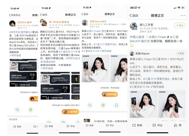 另一边,各大平台的科技博主、时尚潮人也被三星W23、W23 Flip吸引,高呼新品的强大,为年度机皇打call,与网友一起探讨#W23不一样的东方韵味#。