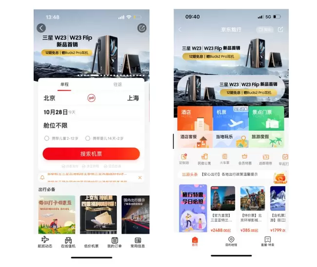 除此之外,京东APP的京东旅行频道更是给足三星W23、W23 Flip排面,在其页面直接进行频道焕肤,抢眼的设计吸睛百分百。而在飞机、火车、酒店的频道里面,也能见到三星W23、W23 Flip的身影,让广大用户更好地了解新品信息。