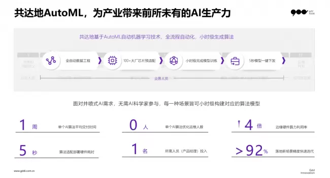 AutoML,即自动化机器学习,被誉为深度学习新一代王者。虽然谷歌早在2017年便率先在产业界提出了这个概念,但长期以来缺乏真正的商业化落地。而共达地在AutoML领域已积累了2年多的商业化落地经验,并推出了GDDi自动化AI训练平台3.0,在智慧城市、智慧园区等多个领域打下了扎实的基本功,属于业内真正的领军者。