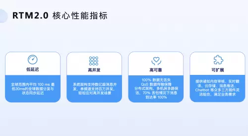 基于六大层面中的网络及运算技术,声网推出的RTM2.0产品可提供实时消息、频道管理、状态通知、存储管理以及分布式锁五大功能。RTM2.0具备“低延迟、高并发、高可靠、可扩展”等核心能力,实时消息可做到全球范围内平均不高于100ms 、最低达30ms传输延迟,满足企业应用场景中对于实时性的严苛要求。