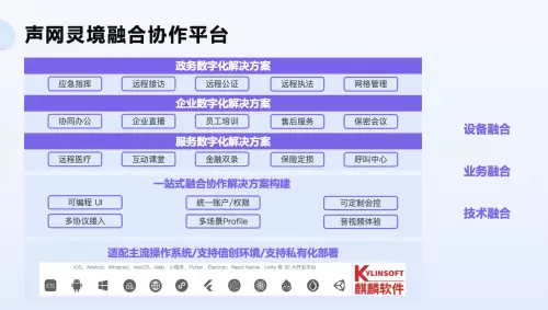 基于这些行业痛点,声网推出了灵境融合协作平台,该套解决方案是基于声网原来在消费互联网领域的积累,并结合实时互动能力,面向企业数字化转型的一套解决方案。在论坛上,刘翔主要从设备融合、业务融合和技术融合三个层面进行了讲解。