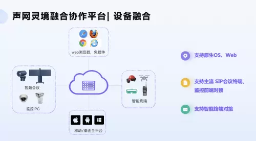 设备融合可以更好的解决旧设备的问题,确保客户在RTC接入的应用上能兼容视频会议、监控设备、无人机、AR眼镜异构智能终端设备等,并支持原生OS、Web,支持主流SIP会议终端、监控前端对接、智能终端对接等。