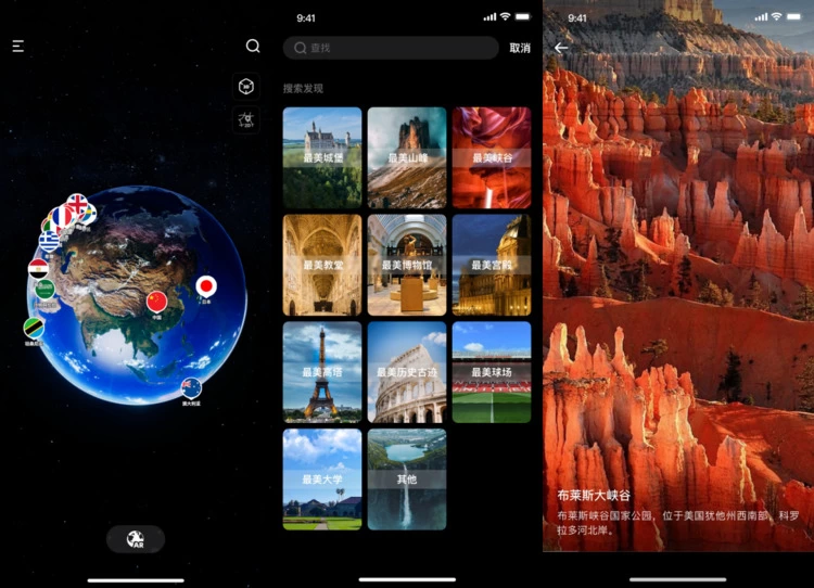 宇宙猜想为用户提供全新的三维看世界视角,从雾霭苍茫的水面到广袤沙漠中的一片绿洲;从浩瀚无垠的星海到万古长明的灯火;穿透热带雨林的光影斑驳,抵达冰雪覆盖的至北之地...... 探索极致世界,走进世界之巅。地球上任何你想去的地方,通过它都能瞬间抵达。