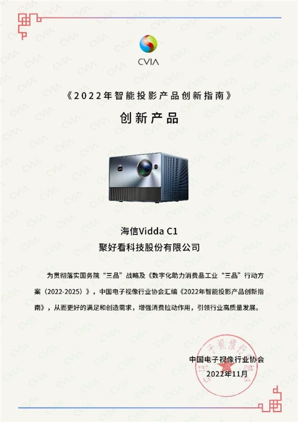 为贯彻落实国务院“三品”战略及《数字化助力消费品工业“三品”行动方案(2022-2025)》,向消费者推荐质量好、信誉高的智能投影企业和产品,中国电子视像行业协会汇编了《2022年智能投影产品创新指南》,其中Vidda C1也荣获《2022年智能投影产品创新指南》创新产品。