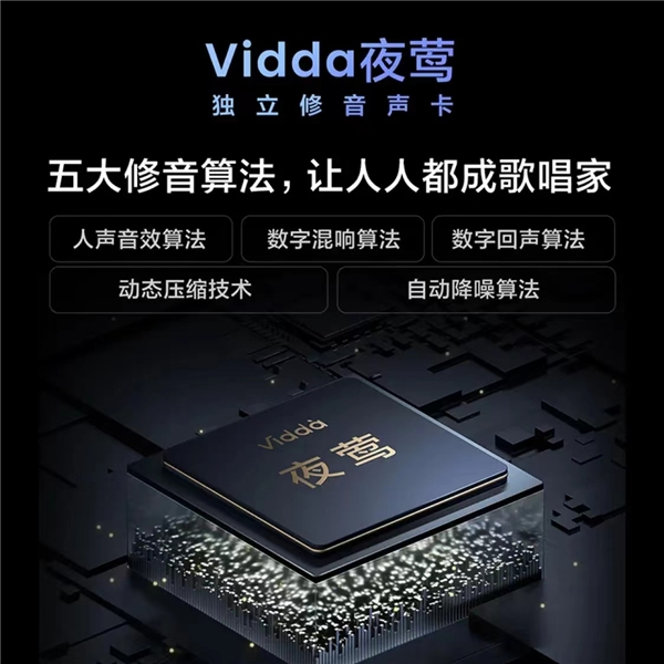 具备独立修音的夜莺声卡,让Vidda音乐K歌电视MUS具备了让人人成为音乐家的可能性。五大修音算法,显著提升了现场演唱者的声线特点,做到自动降噪、数字回声、数字混响、音效算法,为用户营造优质K歌体验。
