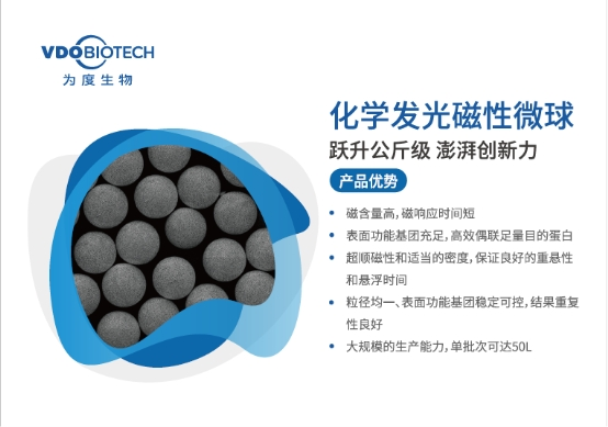 化学发光作为目前IVD的“顶流赛道”,是行业竞争的焦点。此次展会上,为度生物化学发光磁性微球成为了备受瞩目的产品。为度生物在产品性能与产能方面双管齐下,全面赋能客户的化学发光试剂产品开发。全新升级的化学发光磁性微球,具有超顺磁性、磁含量适中、优异的重悬性和较快的磁响应速度等特点。同时单批次公斤级产能,实现了规模化供应且性能稳定;并可根据客户需求提供微球的个性化解决方案,为广大客户开发不同的技术路线提供了更为丰富的选择。