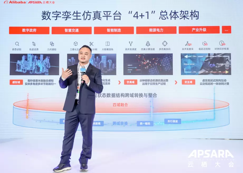 本次全新升级的数字孪生仿真“4+1”的总体架构由感知域、生成域、仿真域和交互域四域构成,其中感知域可以对物理世界的对象进行多源静动数据融合感知、动态元素轨迹还原等操作;生成域可以对物理世界的对象进行自动化的单体化分割、三维化生成、大规模实时渲染;仿真域通过高并发调度、分布式计算加速、以及统一仿真平台技术来对现实世界进行秒级推演预测;交互域通过云边一体协同计算、现实世界到数字世界的高并发数据采集、数字世界到现实世界的低延时控制调度来实现数字底座与业务系统数实融合。感知、生成、仿真、交互四域之间通过跨域数据统一编码、转换、与检索等功能,来支持低延时、高可用、三维化的全过程状态数据的实时同步与智能应用,高效响应政企业务需求。