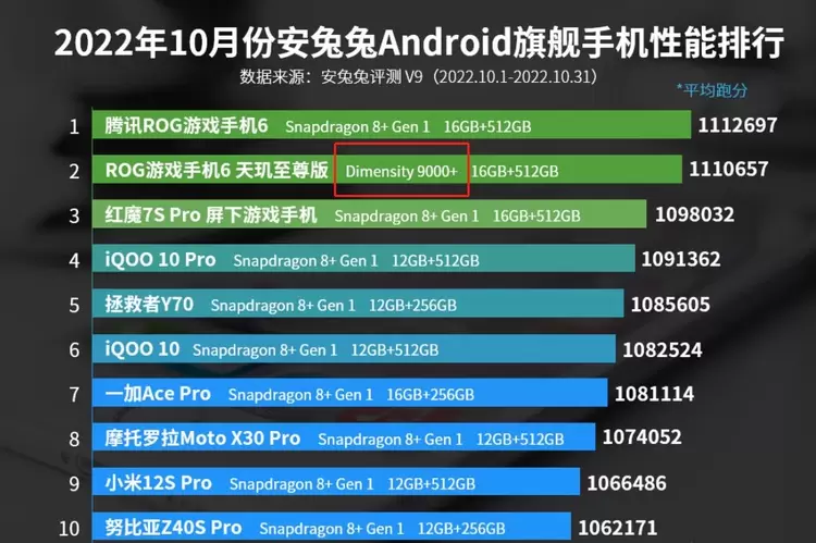 这并非没有根据。日前安兔兔10月份旗舰手机性能榜单出炉,有一部天玑9000+机型上榜第二。考虑到iQOO Neo7的上市时间,或许下个月的性能榜单可以见到它的身影。