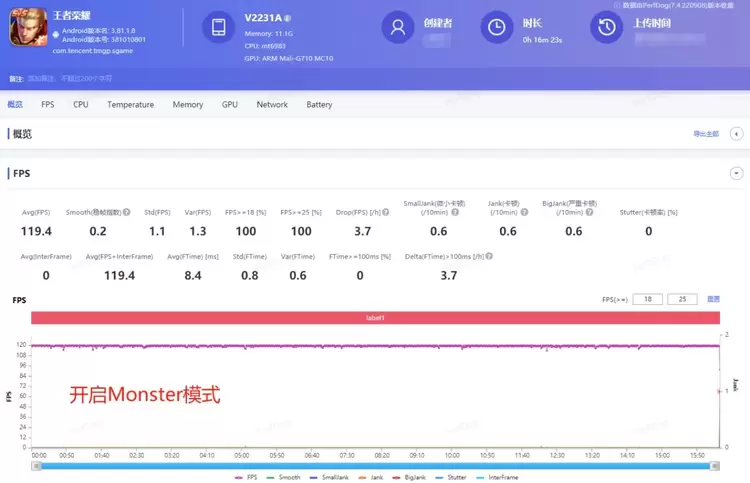 开启Monster模式+原生120帧对局,平均帧率达到117fps,游戏过程有小幅掉帧波动,总体稳定度还行,况且这是在长达1小时高性能模式下进行的,战斗可观。