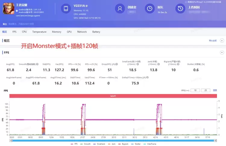 开启Monster模式+插帧120帧对局,平均帧率是61.8fps,插帧换算需要×2翻倍,最后是123.6fps,超出了原生120帧,高刷衔接游戏画面妥了。