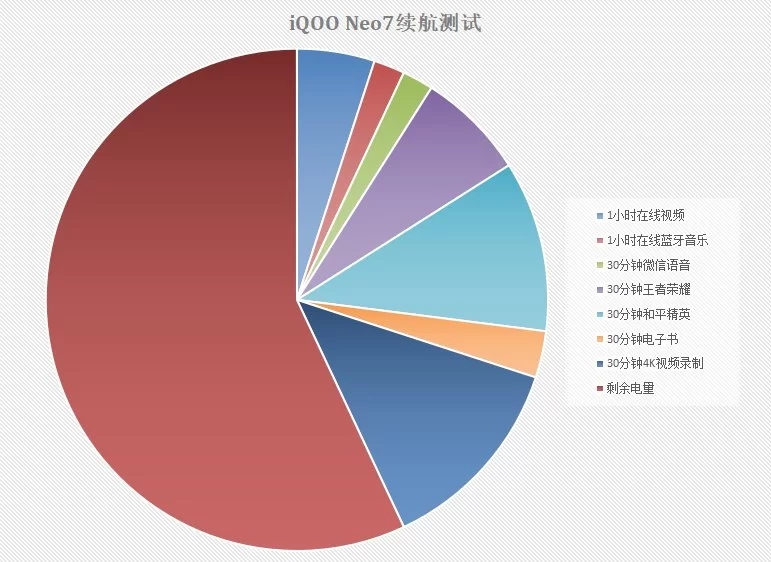 实际上,iQOO Neo7有出色的续航能力,和它的5000mAh电池不无关系,大电池,蓄能多,可以支持手机续航更长的时间。这方面我模拟了日常的用机场景,连续测试耗电4.5小时,最后剩余57%电量,足够自己一天一充的续航需求了。