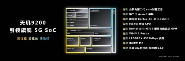 从发布会公布的产品信息看,天玑9200旗舰配置拉满,CPU、GPU、APU和内存、闪存支持的规格都是满血级。