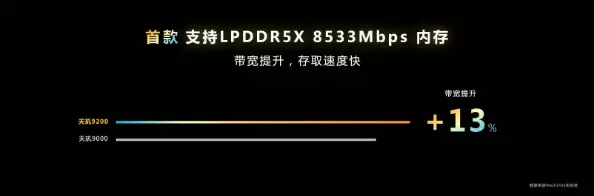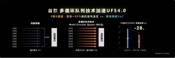 联发科天玑9200支持LPDDR5X 8533Mbps内存和8通道UFS4.0闪存,利用多循环队列技术让数据传输再次提速。