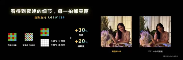 根据发布会现场介绍,为了突破手机镜头的限制,联发科最新的Imagiq 890支持全新RGBW传感器, 可将一半的像素换成白色,显著提升了感光度。手机拍摄时,先分别生成彩色与黑白的两张影像,再经过Imagiq 890 ISP融合处理后可达到两个传感器拍摄的效果。RGBW ISP提升了30%亮度与20%影像细节,在相同尺寸的传感器下,提供更出色的夜景拍摄效果。在室内暗光环境下录像时,噪点更低,清晰度更高的影像,让每一帧画面都亮丽。