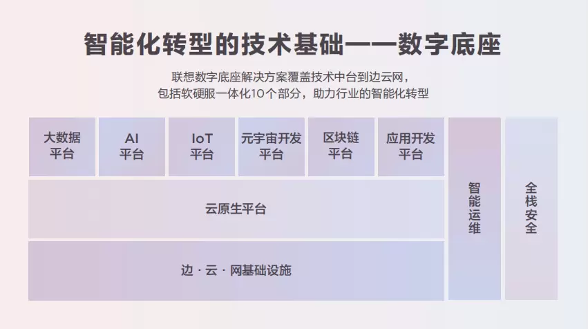 戴炜在演讲中表示,“联想数字底座解决方案覆盖技术中台到边云网,包括软硬服一体化十个部分助力行业的智能化转型。”具体说来,数字底座包括:具备支撑作用的边·云·网基础设施和云原生平台,以及位于技术应用部分的:大数据平台;AI平台;IoT平台;元宇宙开发平台;区块链平台和应用开发平台;加上起到保障作用的智能运维和全栈安全。一个坚实的数字底座,及其与业务中台之间柔性、敏捷的组合能力,将极大地帮助、提升这些不同行业智能化的转型成功率。