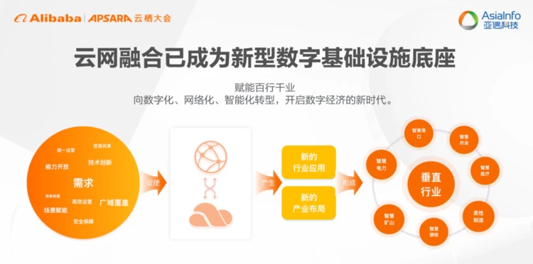 亚信科技针对云网融合趋势与产业需求,依托自身5G、AI能力,联合阿里云推出“新一代云网融合解决方案”,以AI+5G赋能云网一体化运营,通过云、网、边、端资源统一管理调度实现业务协同,通过三个“融合”赋能垂直行业: