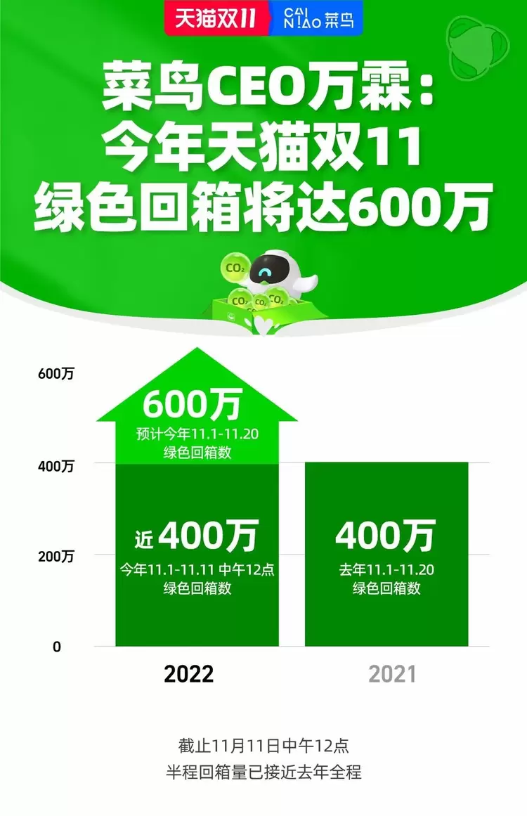 菜鸟CEO万霖:天猫双11绿色回箱预计达600万个,半程回箱量逼近去年全程