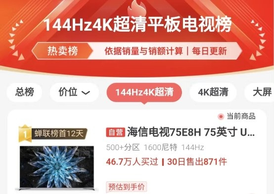 作为2022年世界杯官方赞助商,海信电视于今年9月推出ULED X参考级影像新品E8H和U8H,刷新率分别达到144Hz和240Hz,同时支持VRR可变刷新率、ALLM自动低延迟、满血HDMI 2.1接口等,让游戏玩家随时随地畅享丝滑体验,决胜时刻轻松征服。其中,海信E8H上市不久,即蝉联京东144Hz 4K超清平板电视榜TOP1,成为备受游戏玩家青睐的爆款神器。