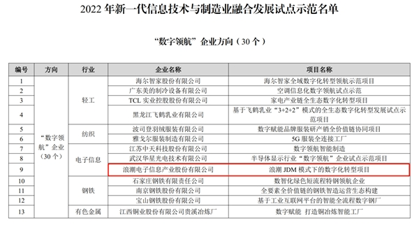 近日,工信部公示了2022年新一代信息技术与制造业融合发展试点示范名单,该示范项目有“数字领航”企业、“量化融合管理体系贯标”、特色专用型工业互联网平台三个方向,本次公示名单为首期评选的“数字领航”企业,浪潮信息以JDM模式下的数字化转型项目成功入选。