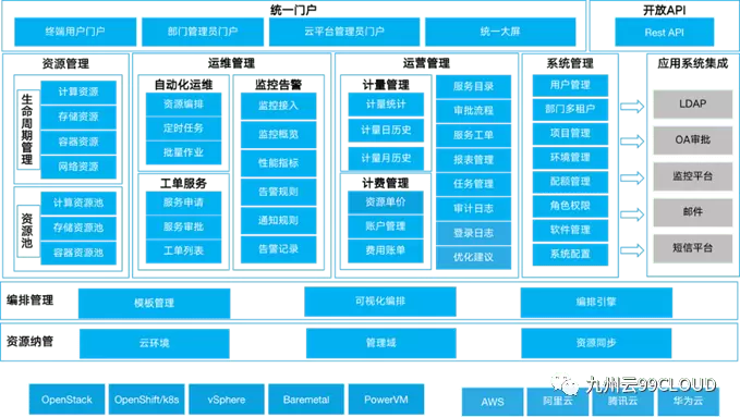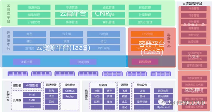 九州云为该公司提供的是由虚拟云资源平台IaaS、容器云资源平台CaaS和混合云管平台CMP组成的智慧管道整体解决方案。其中,虚拟平台IaaS底层对接通用服务器、GPU服务器及网络设备,通过虚拟化技术、网络虚拟化技术、分布式存储技术、资源隔离调度组件等构建虚拟云环境;在虚拟云环境部署容器平台CaaS;而IaaS和CaaS则统一由CMP云管平台运维管理。