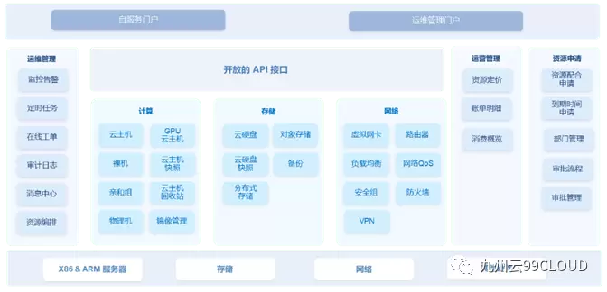 - 虚拟云资源平台IaaS是高可用、高可靠、可扩展的云软件堆栈,其糅合了OpenStack、云原生、Ceph等顶尖云计算、分布式计算技术,并与平台提供的资源管理、故障管理等技术功能一起,结合到整体性的软件堆栈中,从而为业务应用提供计算、存储、网络等虚拟化基础设施资源,并提供了一系列的资源、主机、故障、服务和软件管理能力。在高可用性(High Availability,HA)、服务质量(Quality of Service,QoS)、性能以及低延迟等关键领域中有着明显的优势。