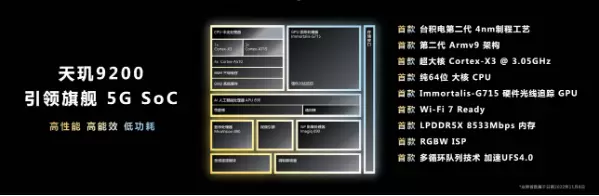 从官方公布配置信息来看,天玑9200堆料十分下本,采用了台积电第二代4nm工艺和第二代Armv9架构,搭载八核旗舰CPU,包括1个主频高达3.05GHz的Cortex-X3超大核,3个2.85GHz主频的Cortex-A715大核,以及4个1.8GHz主频的Cortex-A510小核,并且性能核心全部支持纯64位应用,要知道64位能带来更高的能效表现,是高端芯片发展的必然趋势。